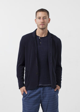 Amiable texture for the pleasure seeking. Plenty of stretch with the coolness of summer. Four button closure at front. Two exterior pockets, one interior. Homecore. Color Navy. 90% Cotton, 10% Elastane. Made in Portugal.  Matt is wearing a Large. Matt is 6’2”, Chest 38”, Waist 31”, Inseam 34.5”.