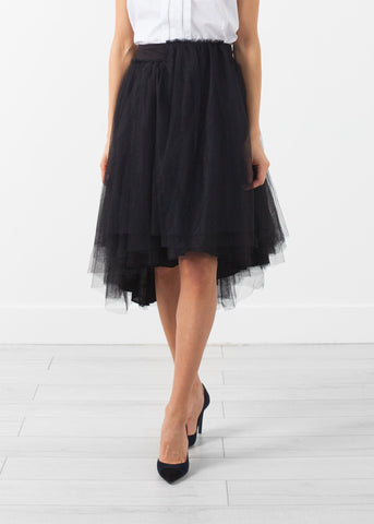 Tulle overlay with layers upon layers of dancing dreams. Invisible zip closure at left side. Lilith. Color Black. 100% Cotton, Tulle 100% Polyester. Ashley is wearing an X-Small.
